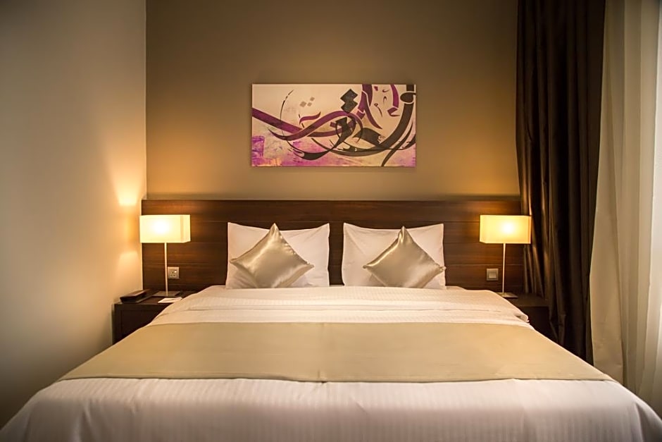 Suite classic one bedroom is 108 square feet and includes a queen-size bed 150-154 width plus hairdryer, ironing set, and safe.